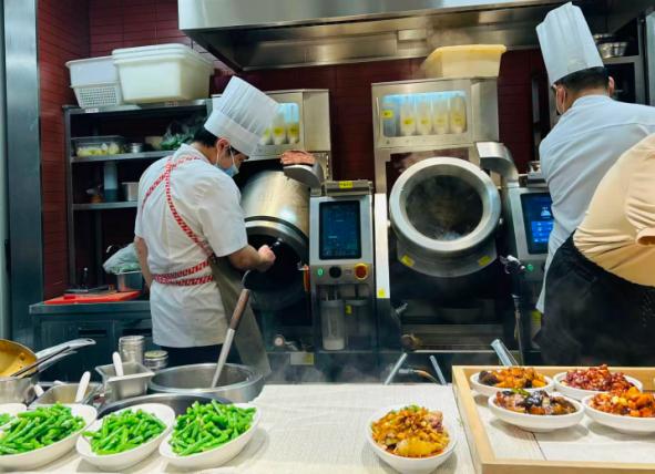 在选餐区的后方,是一条现制、现炒的流水线,从切菜到蒸饭,再到炒菜。其中,老乡鸡统一使用智能炒菜机,乡村基和大米先生的每家门店既有厨师用大锅现场炒制,也有智能炒菜机在不断运转。