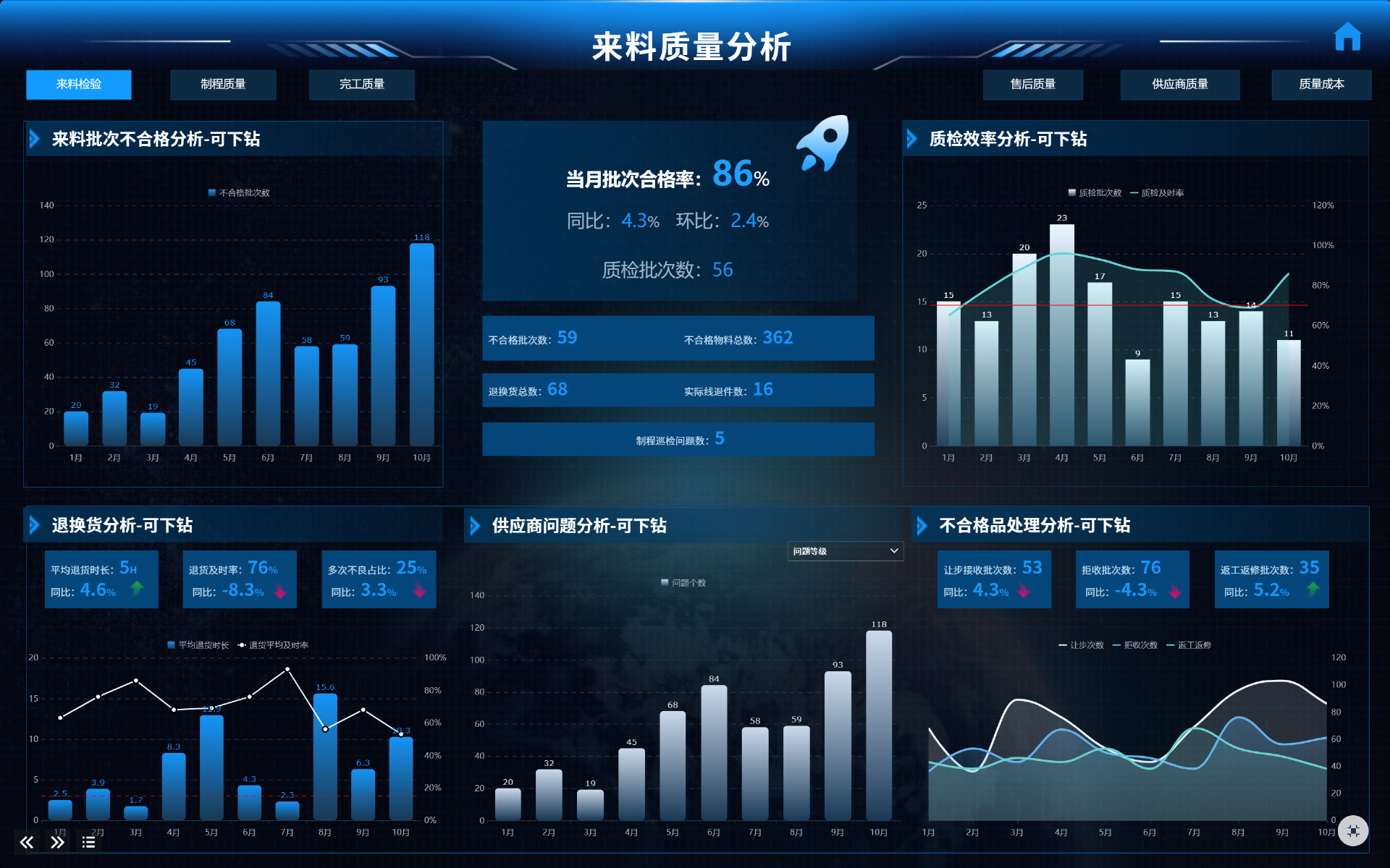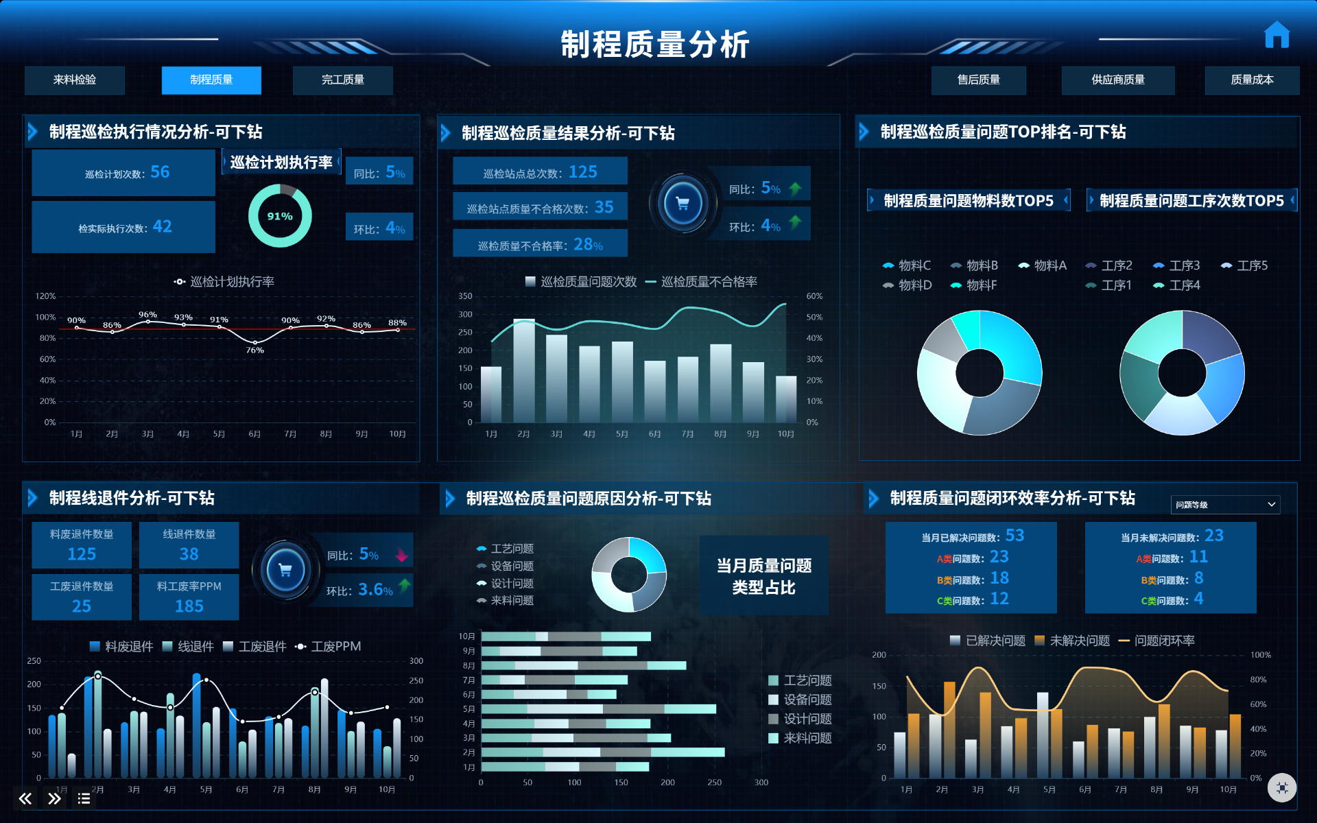 我特地给大家搭建了质量分析平台,涵盖来料、制程、完工、售后、供应商质量及质量成本等板块,展示各环节合格率、问题数、成本损失等核心数据,希望能帮你做到提前预防风险。