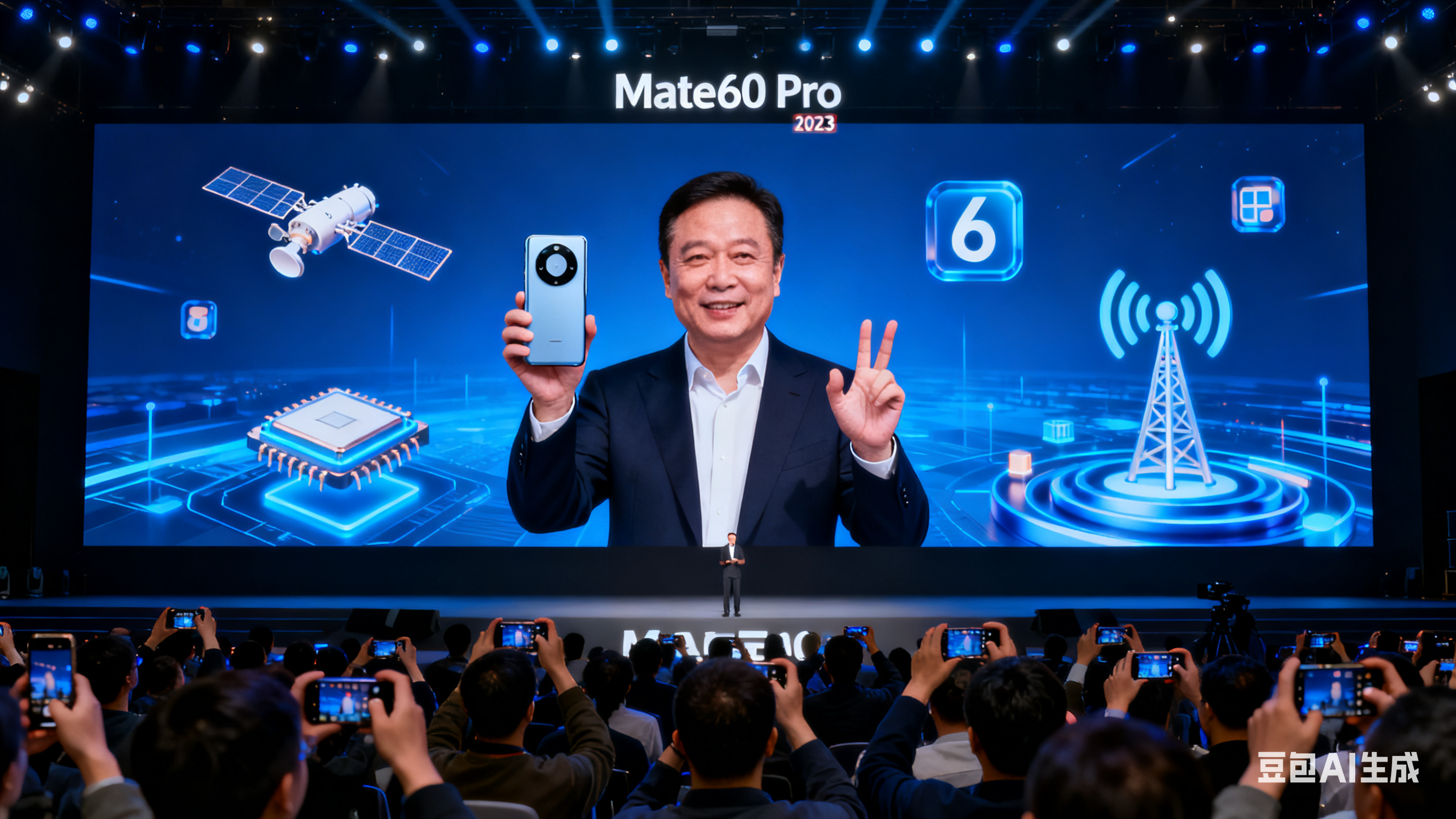 分镜4:2023年华为Mate60 Pro发布现场,余承东手持新机向全球直播,背景是卫星通信、5.5G、AI芯片等技术图标组成的星空。