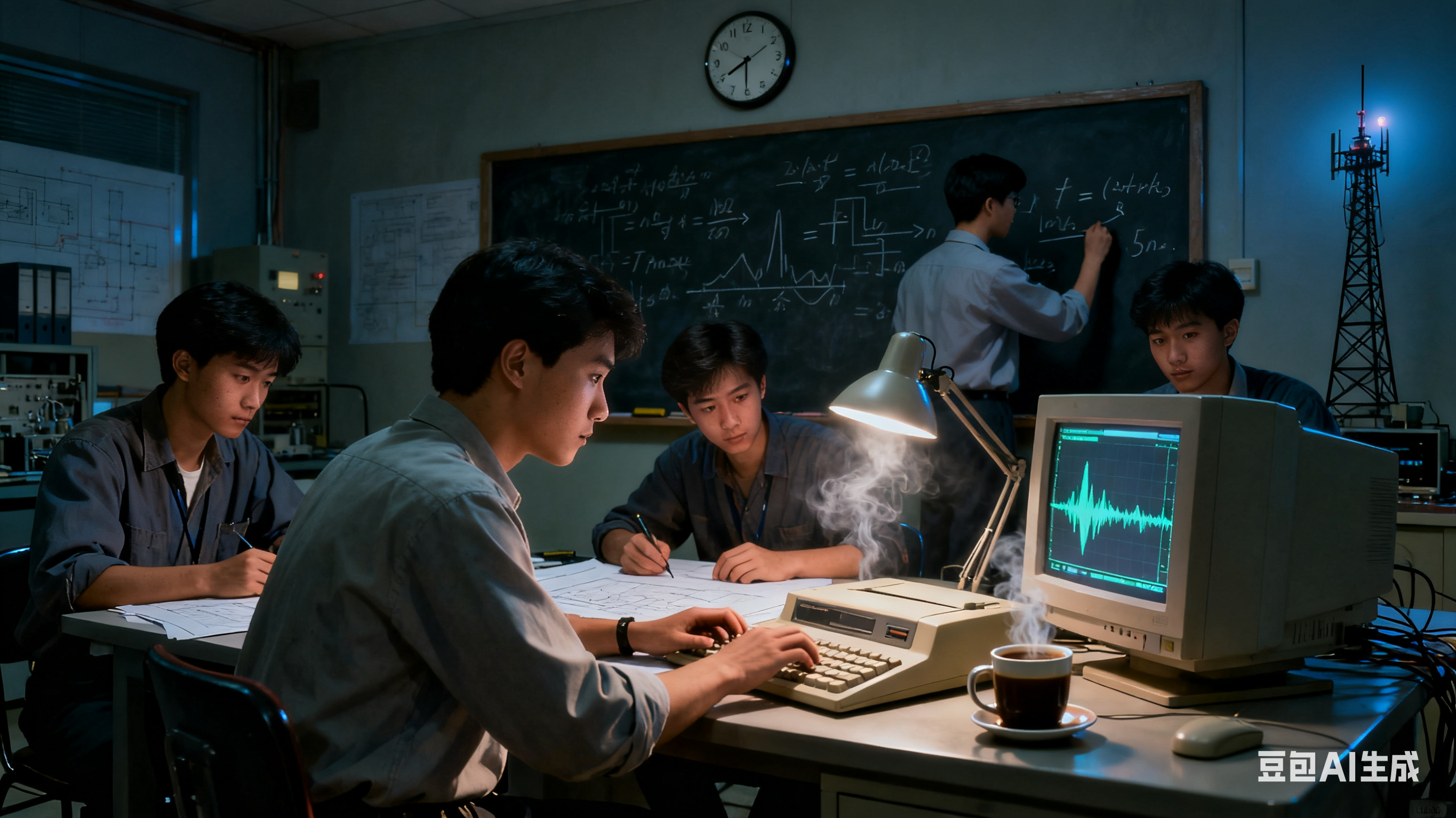 分镜2:90年代研发室,工程师团队通宵达旦攻克2G技术,黑板写满代码公式,电脑屏幕显示基站调试界面。