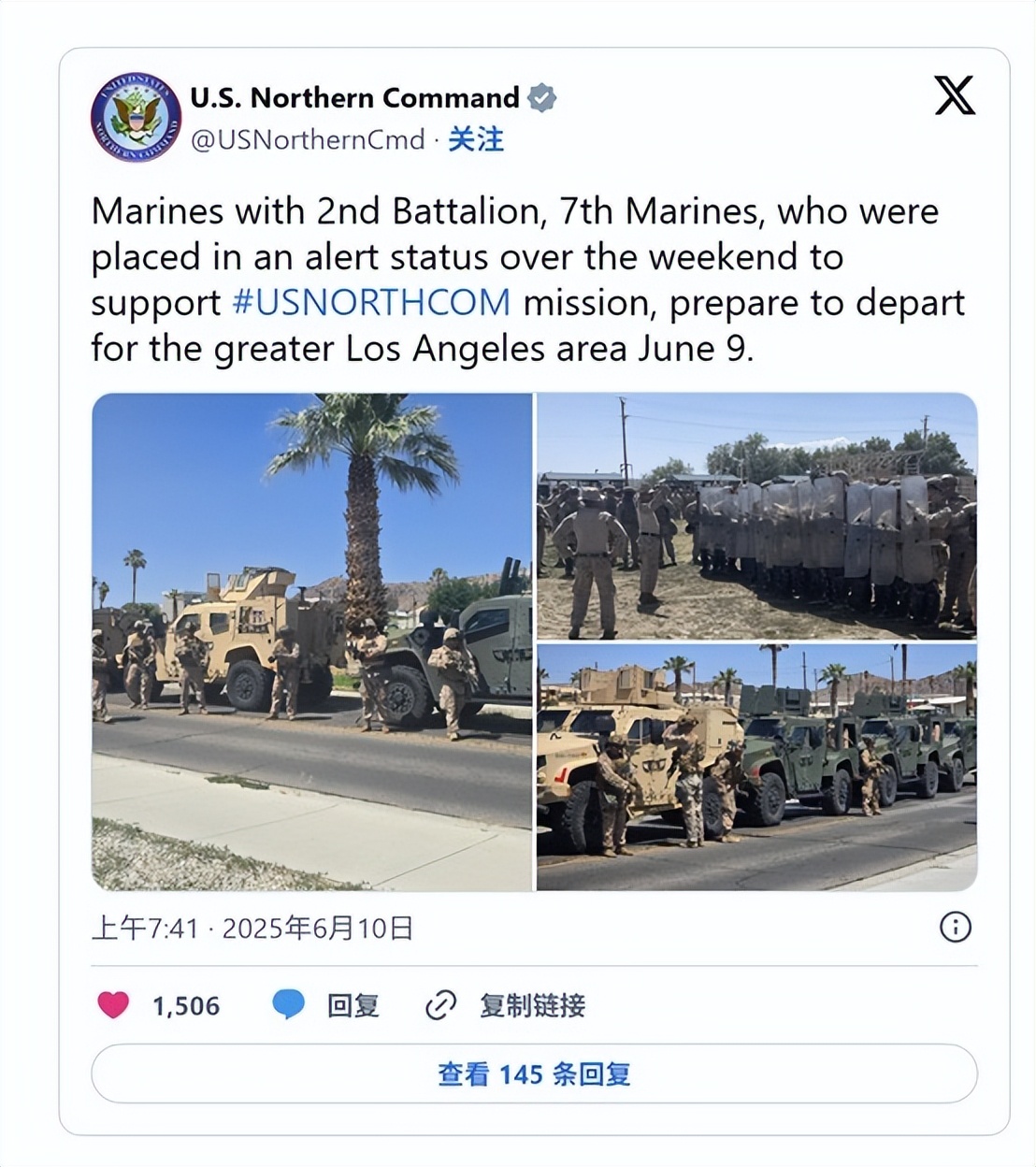 当冲突持续至6月9日,美军北方司令部悍然宣布:驻扎在二十九棕榈村基地的第7陆战团,第2营700名海军陆战队员,已开赴洛杉矶,与国民警卫队“无缝对接”,执行联邦安保任务。