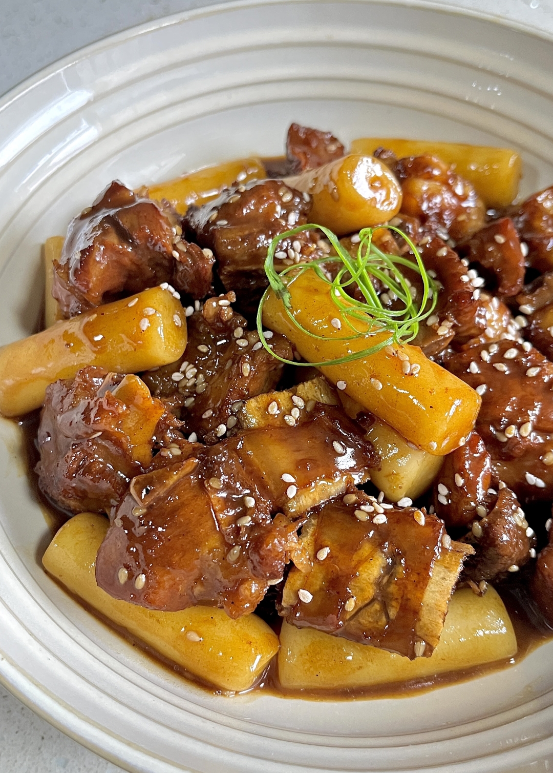 40分钟后,打开盖子,汤汁已经收了一半。这时放入年糕片,轻轻推匀,继续小火炖10分钟。年糕会慢慢吸饱汤汁,变得胖乎乎、糯滋滋。