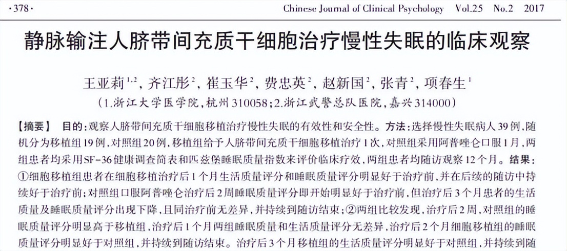 《中国临床心理学》上的一篇文章介绍了干细胞干预失眠症的临床案例,浙江大学医学院和浙江武警总队医院的医生们对39位经过中医药物、认知行为等方法治疗效果不佳的慢性失眠患者进行治疗,其中19位接受脐带间充质干细胞干预,20位作为对照组服用安眠药物阿普唑仑,并随访观察 12 个月。