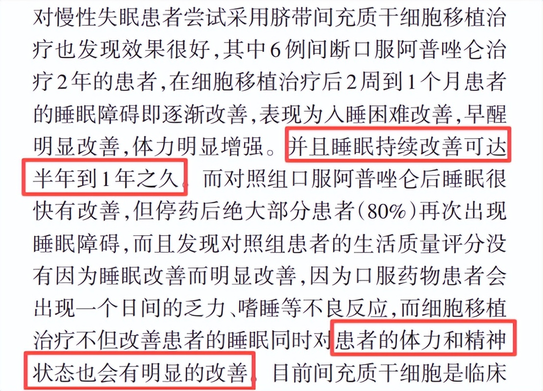 结果显示:药物治疗组80% 出现失眠症状且反弹,而干细胞组仅一次干预的患者睡眠质量和生活质量明显改善,且可持续达1 年之久,无明显不良反应。