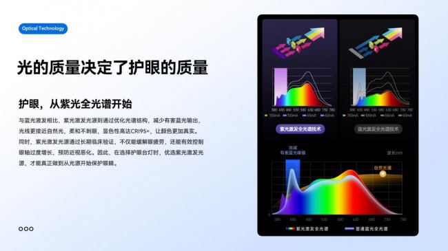 二、光源底层革命:自研第7代SunMaster紫光原芯,从原理上终结蓝光危害自品牌创立以来,书客便确立了“不妥协于传统LED方案,死磕自然光还原”的核心路线。区别于行业“重外观、轻光源”的浮躁风气,书客联合全球知名半导体公司,历经数年研发出紫光原芯,彻底颠覆了蓝光激发的底层逻辑,从根源上解决了LED台灯的有害蓝光危害问题。