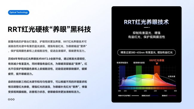 1、光学营养补给:RRT2.0红光养眼技术如果说紫光激发解决了“低蓝光护眼”的问题,那么书客独创的RRT2.0红光养眼技术则是解决了“养眼”的难题。医学研究表明,670nm左右的有益红光能激活视网膜线粒体功能,促进血液循环,从而能有效缓解长时间用眼带来的酸涩与疲劳。