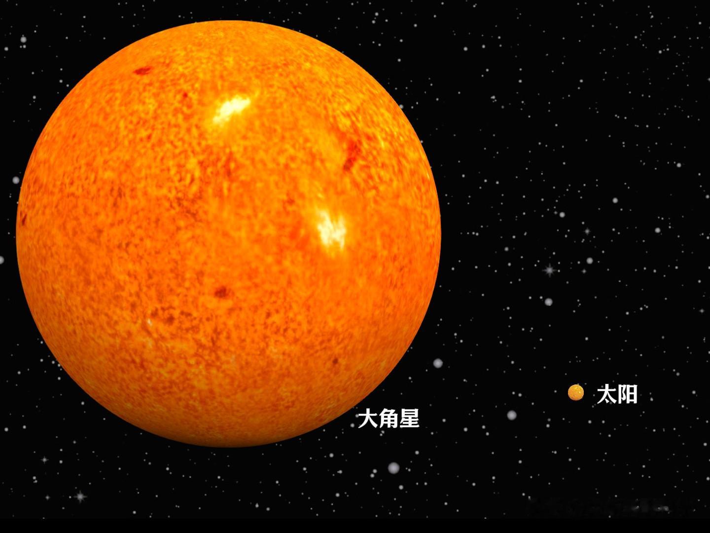 大角星距离地球大约36.7光年,质量约为太阳的1.08倍,半径约为太阳的25.4倍,表面温度约为4286K(大约4000℃),亮度是太阳的110倍。大角星的质量比太阳略大一点,它的半径却是太阳的25.4倍,也就是大约1768万公里,体积是太阳的16000多倍!很显然,大角星已经进入到红巨星阶段了。科学家估计大角星已经有71亿年的“高龄”了。不难预料,在未来的数亿年内,夜空中的大角星会变得越来越红,最终它会成为一颗碳氧白矮星。