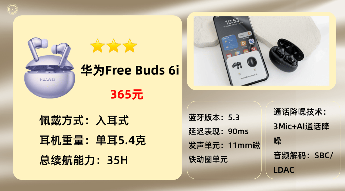 上榜产品2、华 为F reeBuds 6i蓝牙耳机