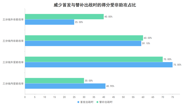 那么为什么威少首发对比替补时会更加给力呢?众所周知威少随着年龄的老化进攻端有两个缺陷,其一是持球进攻的爆发力下降,这一点导致他冲击内线的得分效率降低,如果希望威少担任第六人承担替补席火力,那么他势必要有更多的自主持球单打来带动球队,但若首发出战时球队进攻资源更加丰富,这也令他会有更多的无球空切接球终结机会,他首发时的得分受助攻率对比替补时有了明显的上升,本赛季篮下的命中率也达到了70%。