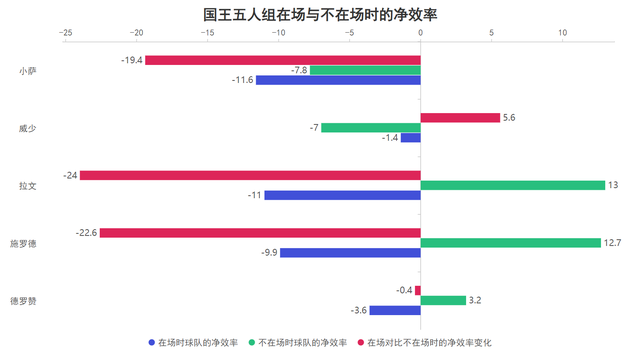 当威少不在场时,国王的净效率仅有负7,当威少在场时,国王的净效率为负1.4,这意味着虽然威少无法令国王从每百回合的净负变为净胜,但他的在场确实令国王每百回合的净输分得到了减少,而在场对比不在场时的正面作用也达到了国王出场时间最多的五人组中的最佳。