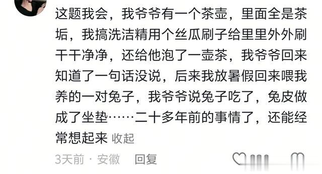 网友一看,纷纷现身安慰,表示这题我会,我爷爷的泡茶壶也被我刷的蹭亮,老头子气的半个月没理我……