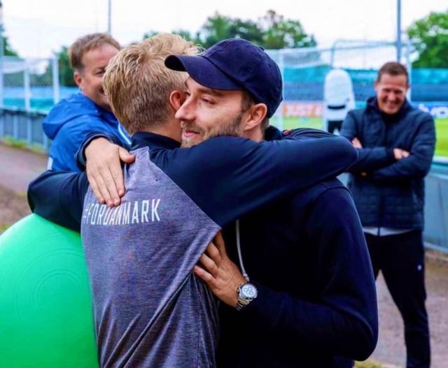 丹麦大腿埃里克森出院看望队友,想必队友们看到他会很高兴也会心有余悸