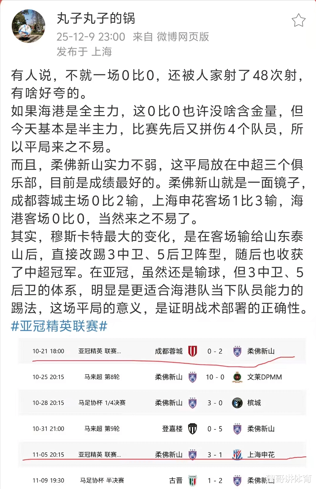北京时间12月10日,当中超冠军上海海港队在亚洲精英赛小组赛中面对柔佛,做到了0-0战平对手拿到了一分后,虽然这一分并不能改变中超冠军在亚洲精英赛上倒数第一的排名。但却让几位上海的知名体育媒体人非常感动,某知名官方体育记者“丸子”更是在个人社交上认为:海港的这场平局,放在中超3个俱乐部中是成绩最好的,柔佛是一面镜子,成都蓉城主场0-2输柔佛,上海申花客场1-3也输柔佛,海港客场0-0,当然来之不易。