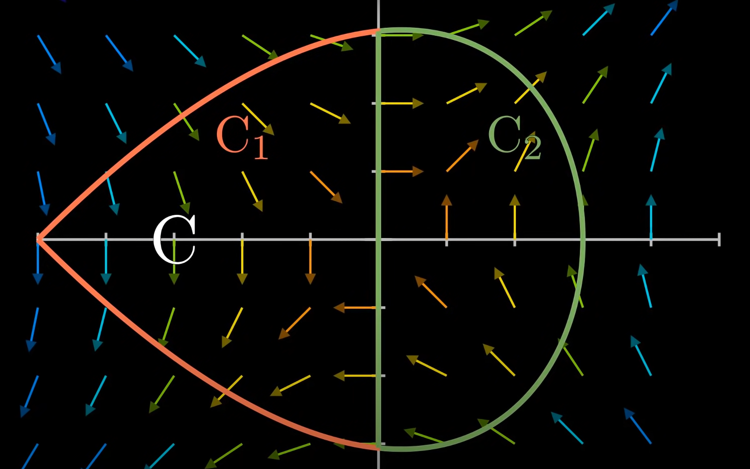 这和在C上的线积分是一样的!这是因为中间的线被抵消了。一个是从上到下,另一个是从下到上。这是一个非常重要的事实。它意味着我们可以将曲线分成任意数量的曲线。