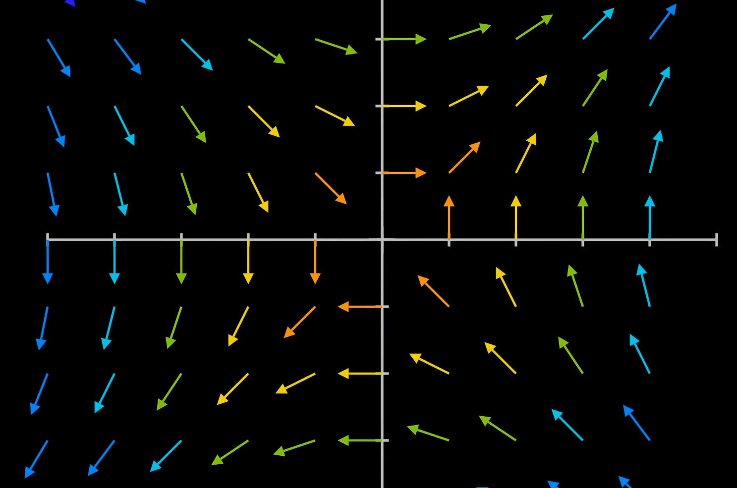 要理解这个向量场的概念,你可以想象在一个平面上的每个点上都放置了一个向量。这些向量代表了不同的方向和大小,形成了一个完整的向量场。在解释这个向量场时,我会使用不同的颜色来表示向量的大小(场的强度),因为如果用长度来表示,图形会显得过于复杂。