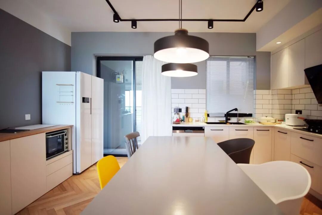 把餐厅与厨房做成一个统一的空间来规划,餐桌摆在操作台的中间,四周是厨房操作台的洗-切-炒,出锅的菜就可以直接端到餐桌上,生活动线短而方便。