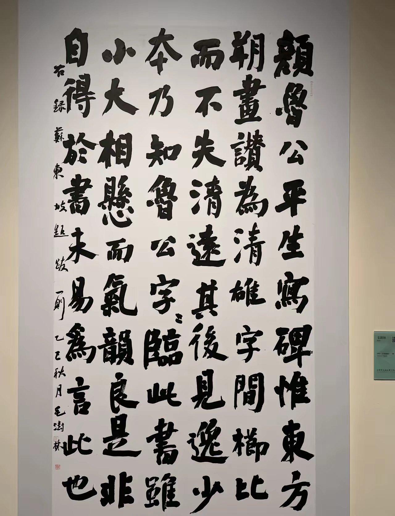 第二是形式表达与文本选择的和谐统一。当前展厅化的展示要求,必然会带来作者对创作形式的现实关注。楷书创作章法形式上很难形成如行草书那样的气势表现和感官刺激,本届展览相较于其他书体作品形式过度拼接较少,这有利于作者更加关注书法本体的艺术表现。但有些大字楷书过于强调刚猛和开张,在字法结体、线质内涵和墨色变化上缺少蕴藉和气象;有些大篇幅的中楷、小楷作品,以超多字数的技术性书写来博取功力认同;还有以固有程式的章法安排来创造空间的分布变化,为求章法形式随意断行、断句;有的题额和落款文字利用百度搜索作者简介或者说明书式的文章介绍,并运用不同书体呈现等,这种范式化的创作模式看似章法完整,符合当前展厅的视觉要求,实质上暴露了作者对艺术实践不够严谨和文化素养的欠缺。
