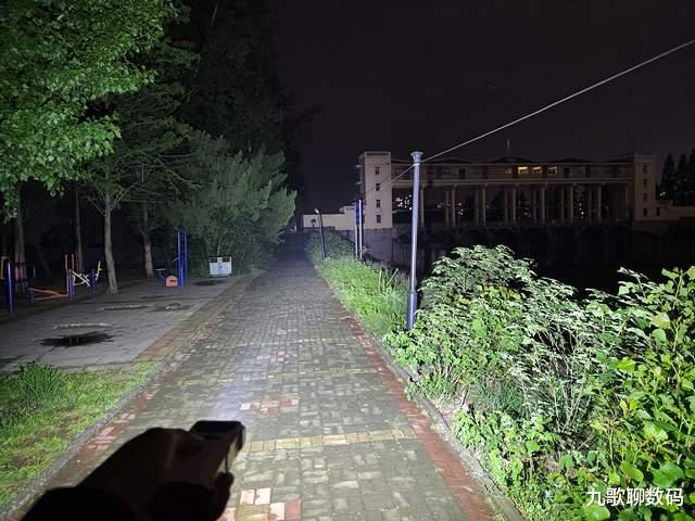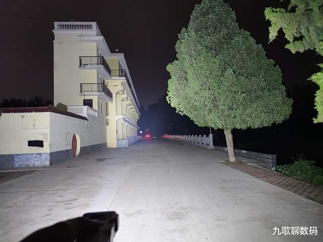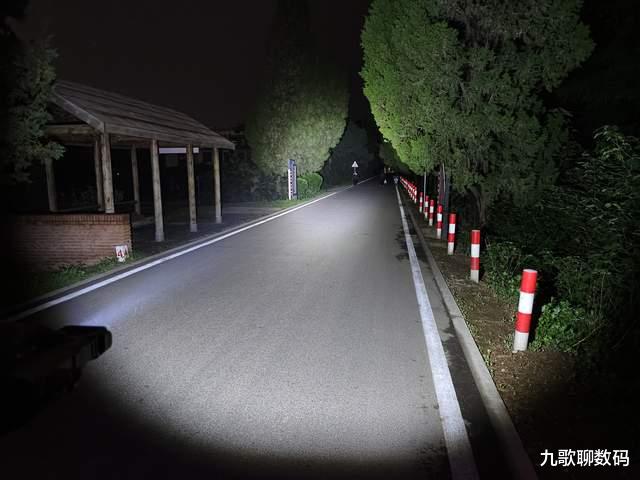 泛光极亮(8650 lm,后降至3000 lm持续1分钟直至稳定在高亮)、高亮(1800 lm),后面三档亮度与远光相同。泛光日常应用广泛,它的铺路效果很好,有着更为开阔的视野。走夜路、探险常用。可以看到它的泛光区域很大,区域内的光线均匀,极亮下瞬间就能覆盖近乎整片镜头。
