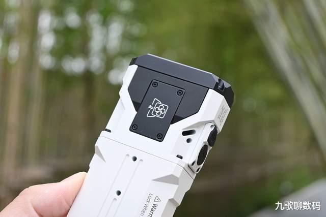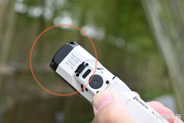 侧键正中带有红蓝双色的电量指示灯,我们可以直观实现了解当前电量情况。上方则是带有三防塞的USB-C充电口,支持30W快充和15W的反向充电,充电速度很快,两小时就能“满血”。不过略显可惜的是仍为胶塞,并未采用时下流行的金属翻盖。