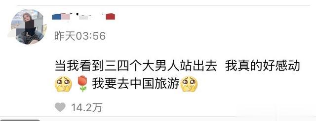 有外国女网友表示:当看到三位男人站出去时,内心非常感动。想来中国旅游。