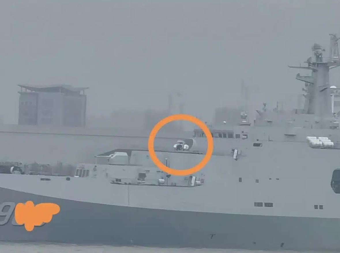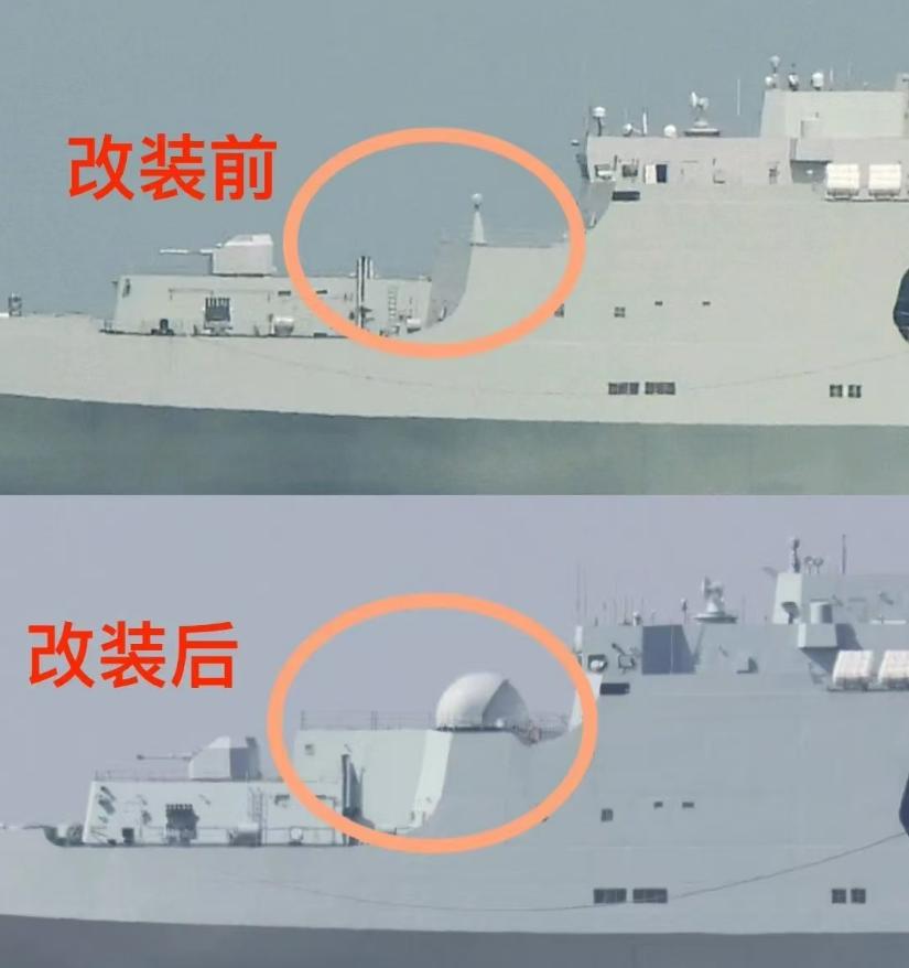从流出的相关照片显示,舰载激光武器与此次阅兵展示的LY-1舰载高能激光武器系统高度类似。该舰前部上层建筑有小部分做了明显改动,新增了一个抬高的平台,平台上安装了带有可伸缩保护罩的炮塔状装置。