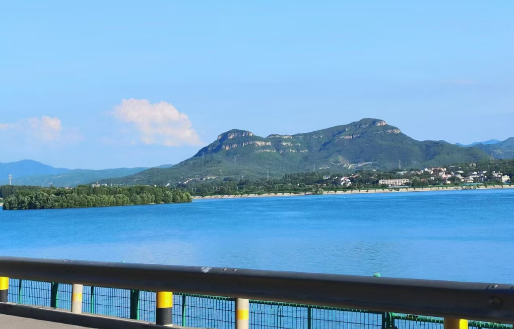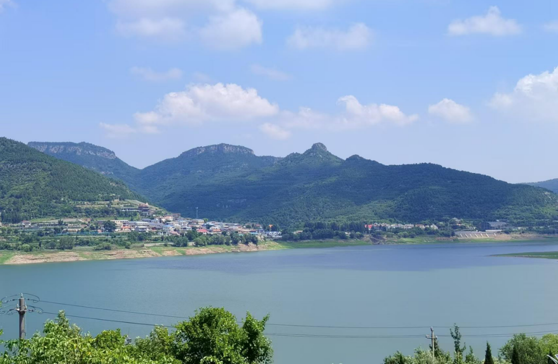 卧虎山水库位于三川汇流的玉符河河口,也称镜儿湖,在晴天里水面更显湛蓝澄澈,波光粼粼,一阵轻风拂过,暑气随之消散,带来难得的清新与宁静。