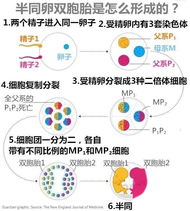 五、半同卵双胞胎的发现除了多精入卵和“超级精子”现象之外,在现实生活中还出现了一些非常罕见的双胞胎案例,比如半同卵双胞胎。所谓半同卵双胞胎,指的是双胞胎中的两个胎儿在遗传物质上既不完全相同,也不完全不同,而是介于两者之间的特殊状态。