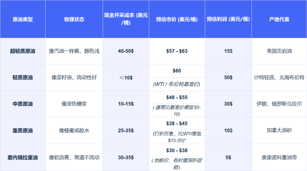 而委内瑞拉的重油属于油品里价值最低的那档,糟糕的质地加上制裁折扣,现金开采成本30美元/桶,但售价也不过30-40美元一桶,一桶重油利润只有几美金,