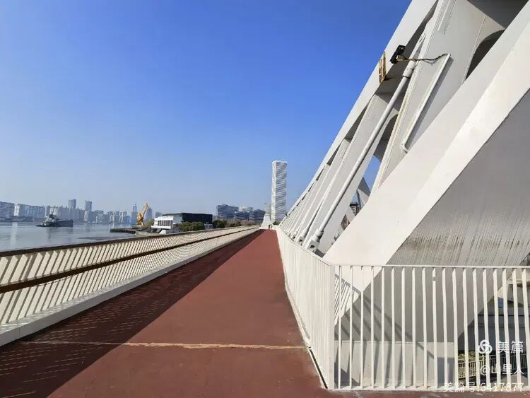 跨越川杨河步道(骑行道)桥。这个专门开辟的桥,与不远的川杨河机动车桥平行,但是紧贴黄浦江,城市规划建筑在浦江滨江步道沿线随处可见。