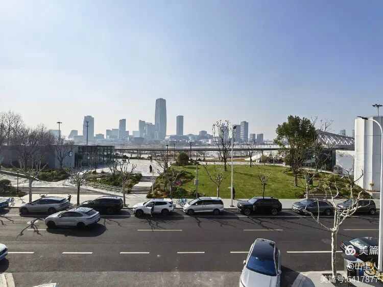 川杨河店前的浦江、浦西,川杨河店后的马路,左侧的星巴克店。