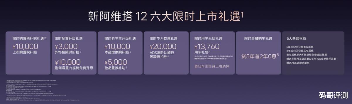 新阿维塔12定位未来智能豪华轿车,面向时代精英人群,主打豪华、智能、旗舰级出行体验。新车全系标配12项顶格配置,涵盖华为乾崑智驾全系统、太行智控2.0、35.4英寸4K全景星环屏、25扬英国之宝音响、全车9安全气囊等,百万豪车顶配选装功能悉数标配。同时推出六大限时购车礼遇,购置税补贴礼遇、配置升级礼遇、老车主升级礼遇、ADS高阶包抵扣权益、贷5年首2年0息金融礼遇、万元用车无忧礼遇,入门即满配,彻底打破豪华门槛。