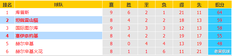 芬超冠军附加赛第9轮,古比斯逆转图尔库国际,赢下关键战,八场不败64分高居榜首,埃尔维斯落后多达5分,想狙击榜首有难度,图尔库国际58分排名第三,塞伊奈约基两场不胜终结四连胜,55分排名第四,战意不高。赫尔辛基附加赛无胜,格尼斯坦上一场打平终结三连败,还是32分垫底。