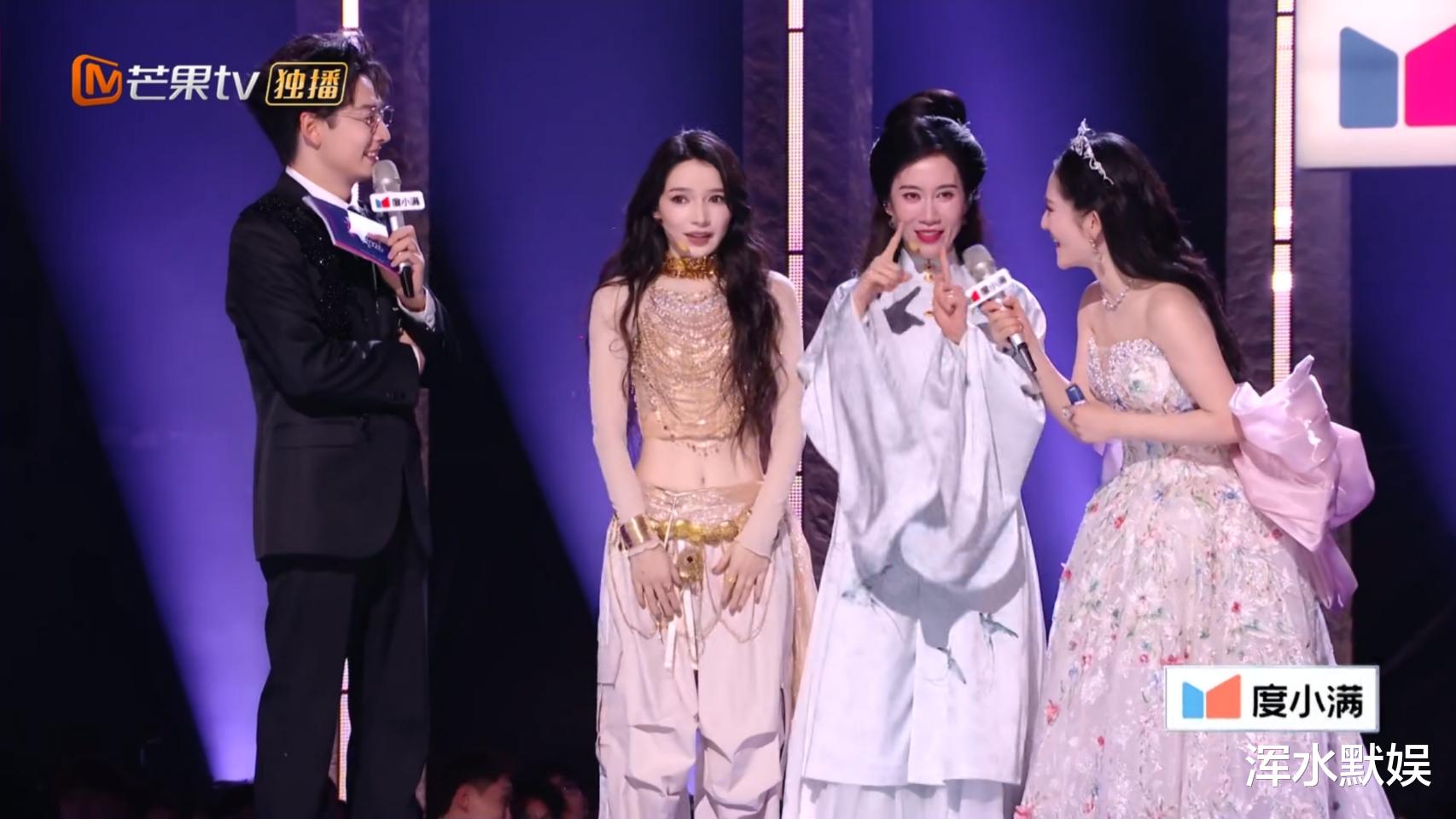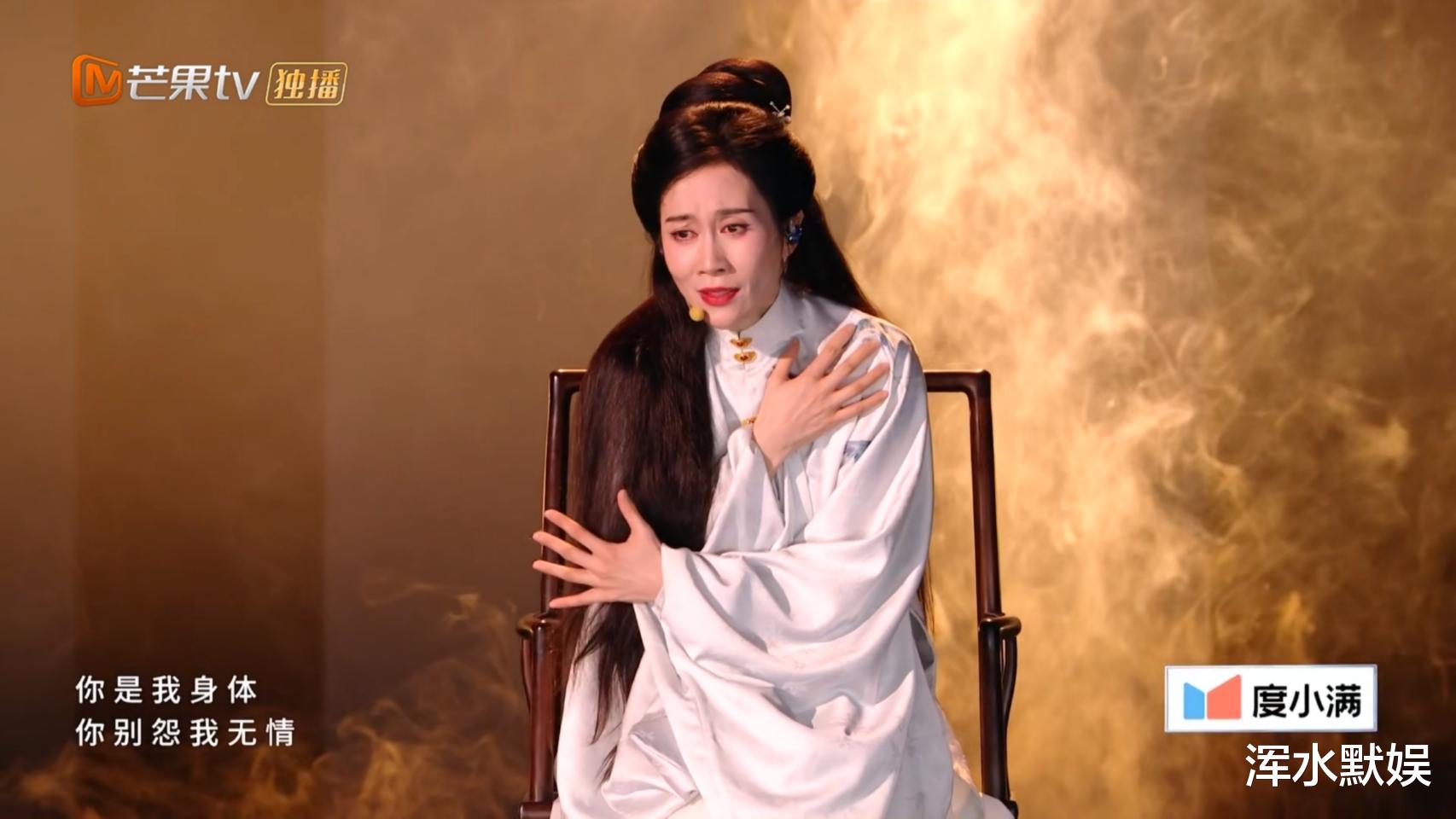 再看温峥嵘,跳了一段古装舞,动作是美的,但垫音大到离谱,和自己的人声完全不同步,活生生唱出了“二重唱”效果,气息还飘得不行,简直是“假唱式表演”。
