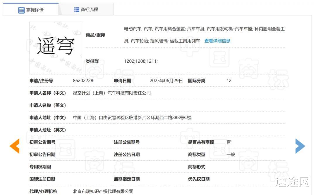 以“遥穹”为例,国家知识产权局商标局显示,“遥穹”商标由星空计划(上海)汽车科技有限责任公司于2025年6月29日申请,目前处于“等待实质审查”阶段。