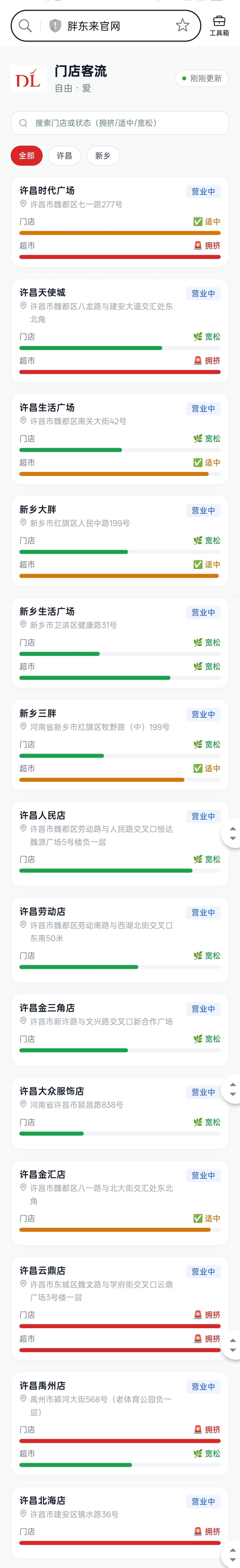 近日,记者在胖东来官网看到,其在官网上上线了一项名为“实时客流”的功能。点进去可以看到该功能能实时查看胖东来包括许昌和新乡14家门店实时客流情况。也就是说,以后想去逛胖东来的小伙伴,可以提前查看其各门店实时客流,选择客流较少的门店购物。