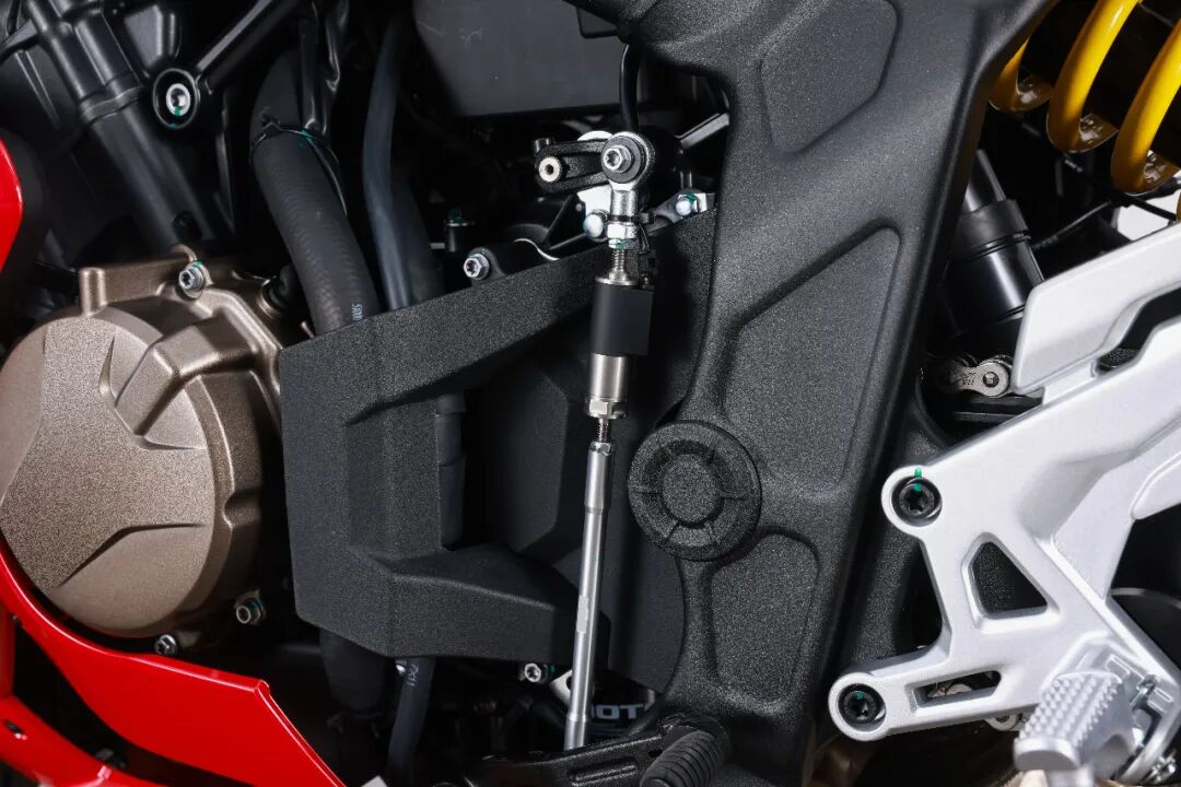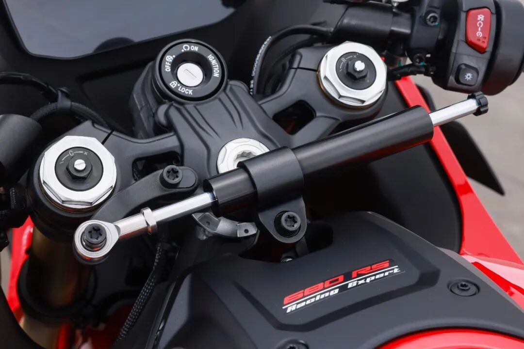 马祖奇转向阻尼器, 原厂就已经配备了,它可以阻止高速时车头的晃动,让稳定性和指向性都得到改进,而且还支持多级调节,能够适合不同骑行的场景。