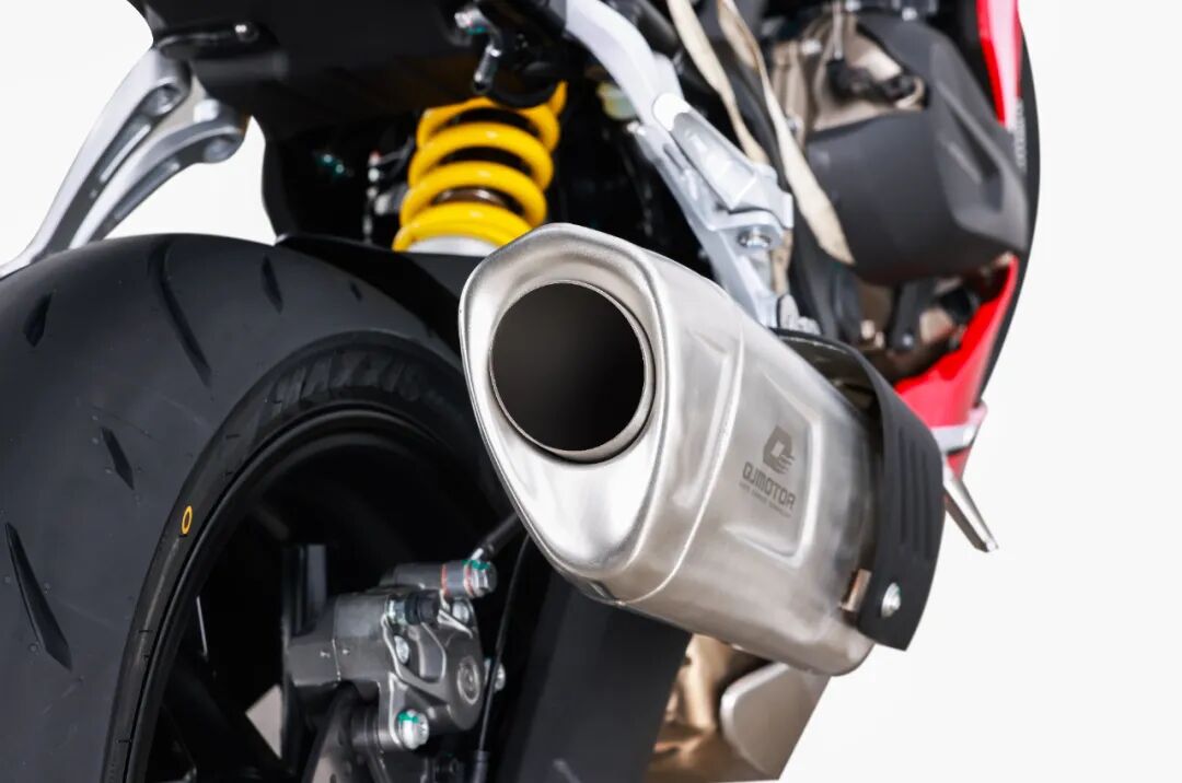 运动直出排气,采用赛800RS同款的加长设计,视觉上看起来攻击性比较强, 还能优化排气声浪,提升骑行时的感受。
