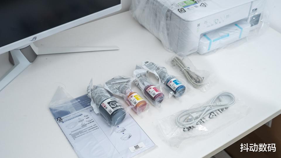 主要附件是说明书、四种颜色墨水以及电源线和USB数据线。不过其支持Wi-Fi无线打印功能,其实USB线都可以省去,家里的电脑、手机都可以实现无线打印。
