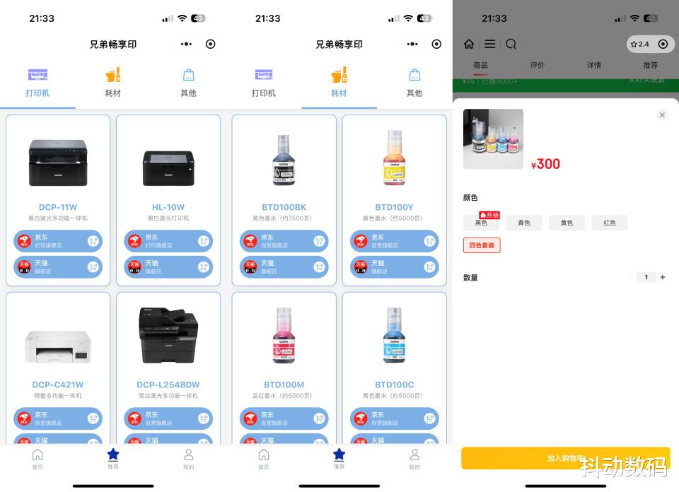 另外小程序中还提供了详细的打印机、耗材购买方式,可以一键跳转电商平台直接购买,比如我可以单独购买单色墨盒或者一次购买四色成套的墨盒。