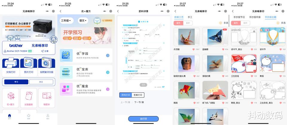 当然,这台只要700+的打印机,让我最惊喜的还是微信小程序「兄弟畅享印」的深度。除了可以直接在小程序实现各种文稿、照片打印,它还提供了各种方便家庭用户的素质教育素材,如丰富的学习资料、字帖、试卷,甚至还有折纸以及手抄报模板。真的,早五六年,孩子一年级的时候家里有这个我就不会头疼了。