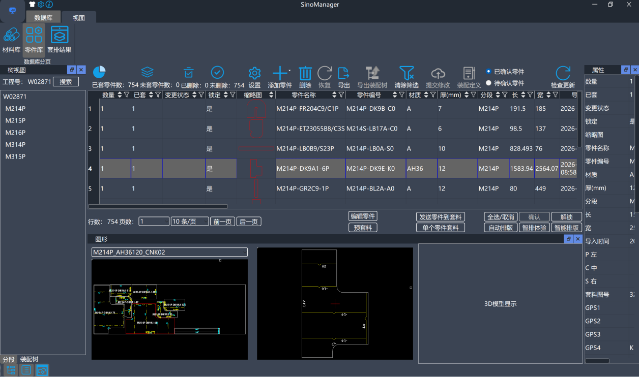 SinoManager零件库可识别AM、SPD、Tribon等设计软件导出的零件图,以及CAD、cadwin等导出的排版图,完整、准确的抓取相关信息,将零件或排版图导入到SinoCAM智能排版软件中,用户可以在软件中批量修改零件信息,包括工程号、分段号、工厂编号等,让零件归纳有序,一目了然。