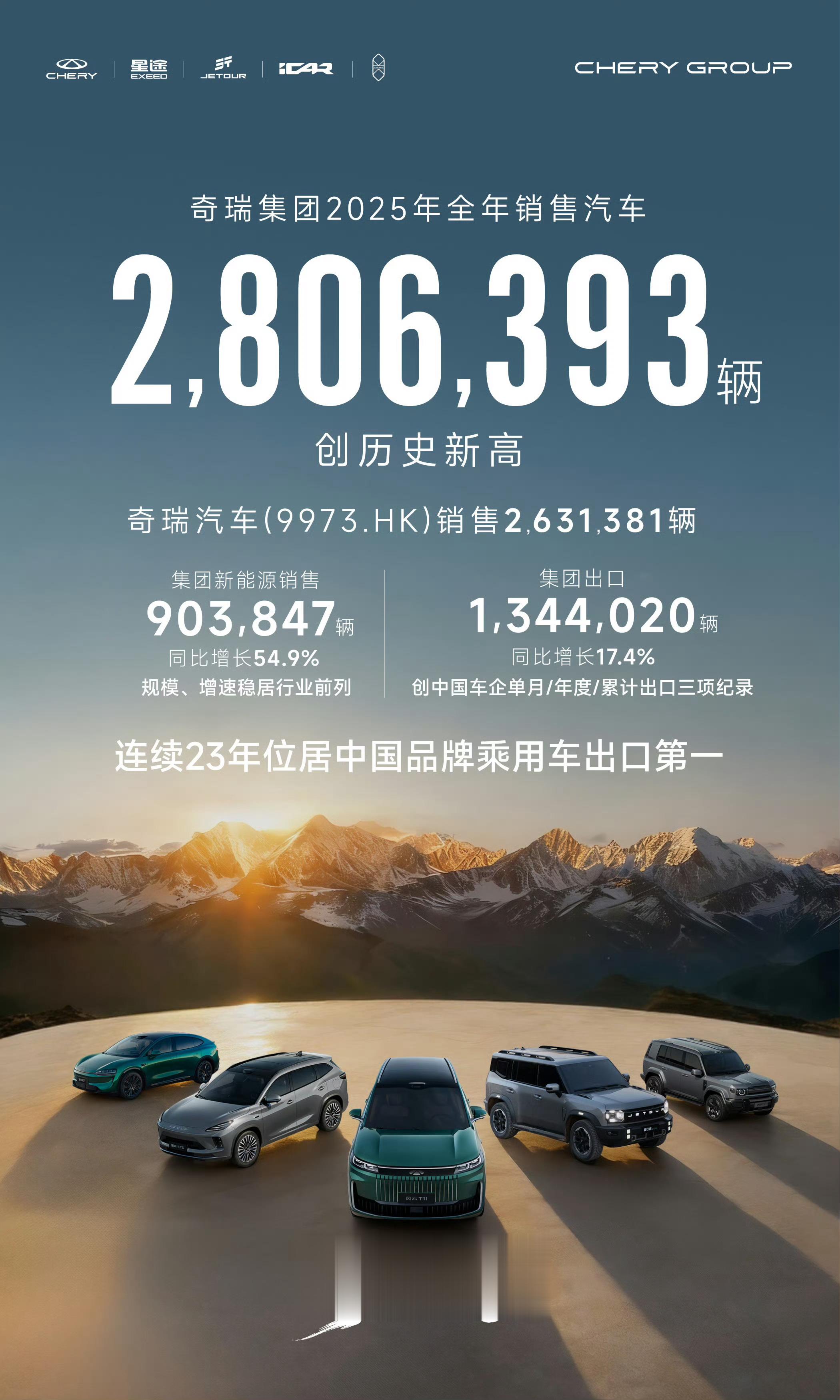 奇瑞集团2025年全年销售汽车280.63万辆,集团新能源销售90.38万辆,同比增长54.9%,放在整个行业当中也是相当不错的数据。最关键的是奇瑞集团在2025年出口数量达到134.40万辆,创造出中国车企当月/年度/累计出口三项记录,奇瑞已经连续23年位居中国品牌乘用车出口第一,成为海外市场中国汽车的代表品牌。
