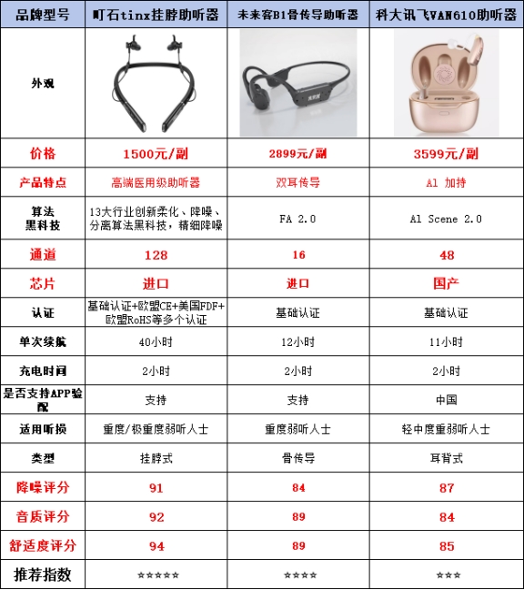 测评结果:町石>未来客>科大讯飞町石助听器音质表现町石助听器的音质表现真心不错,特别是在清晰度和细腻度方面,给人一种非常自然、清晰的听感。它采用了SCS人声频段增益技术和高密度移频技术,辅以双钕磁铁动铁单元,音质显得很有层次感。实测中,人声清晰度提升了105%,日常对话中能够很清晰地捕捉到语音的细节,尤其适合安静的环境,听起来非常舒服。未来客助听器音质表现未来客的音质表现也还不错,清晰度和真实度都在大多数环境中能得到很好的呈现,尤其在人声的表现上,算是相当令人满意。它应用了多频段动态调节技术,能够调节低频和高频的表现,让声音更自然。唯一的小缺点是在噪音环境中,声音的细节表现稍显模糊,佩戴时间久了,也可能会感到有点不够细腻,但总的来说,日常使用完全没问题。科大讯飞助听器音质表现科大讯飞助听器的音质表现一般,虽然清晰度还过得去,但相较于其他两个品牌,它的细腻度和真实度就稍逊色了。它采用了智能降噪技术,能够在噪音环境下提升语音的清晰度,但在复杂场景中的表现还是有些局限,尤其是高频和细节部分不太够清晰。适合安静环境中的日常使用,不过如果想要听更细腻、层次感强的音质,可能就得考虑其他选择。