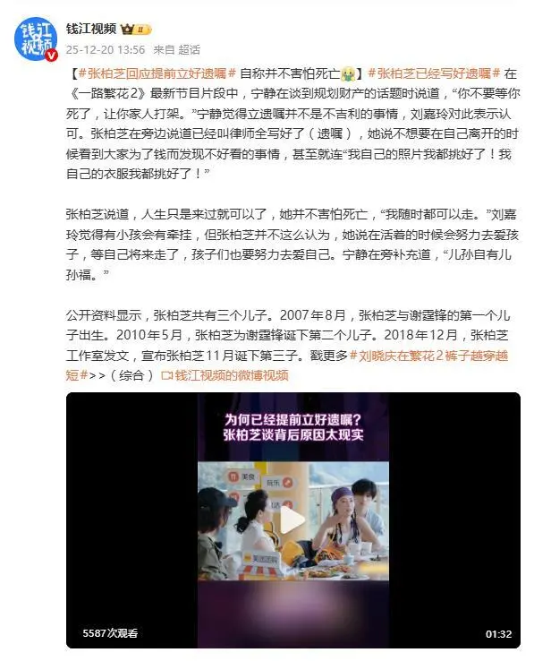 内娱又出“人间清醒”名场面!12月20日,在最新一期《一路繁花2》的饭局夜谈中,当宁静聊到“中国人忌讳立遗嘱,却总有人身后为财产反目”时,张柏芝突然轻描淡写地抛出重磅发言:“我已经叫律师全写好了,照片我都挑好了,衣服我都挑好了!” 这番对身后事的坦然规划,不仅让现场的刘嘉玲、何赛飞等嘉宾面露惊讶,更直接炸翻全网,网友纷纷感叹“这才是顶级责任感,把爱和体面都留到了最后”。