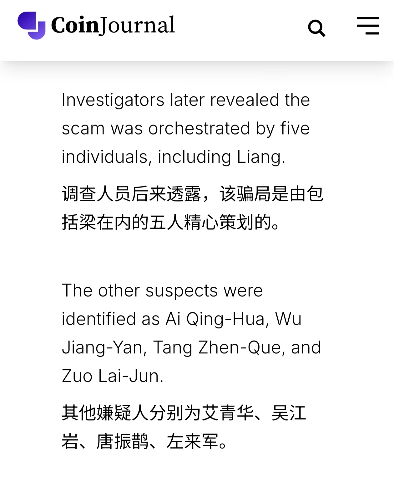 受害者损失惨重,一些报道称涉案金额相当于1亿元人民币(约1400万美元),但更详细的链上分析显示实际更高。其中,梁艾冰与唐振学负责平台开发,艾庆华与吴江艳负责宣传推广,左来军则负责市场营销。目前除梁艾冰被捕外,其余几人仍然再逃。