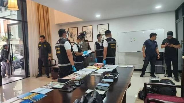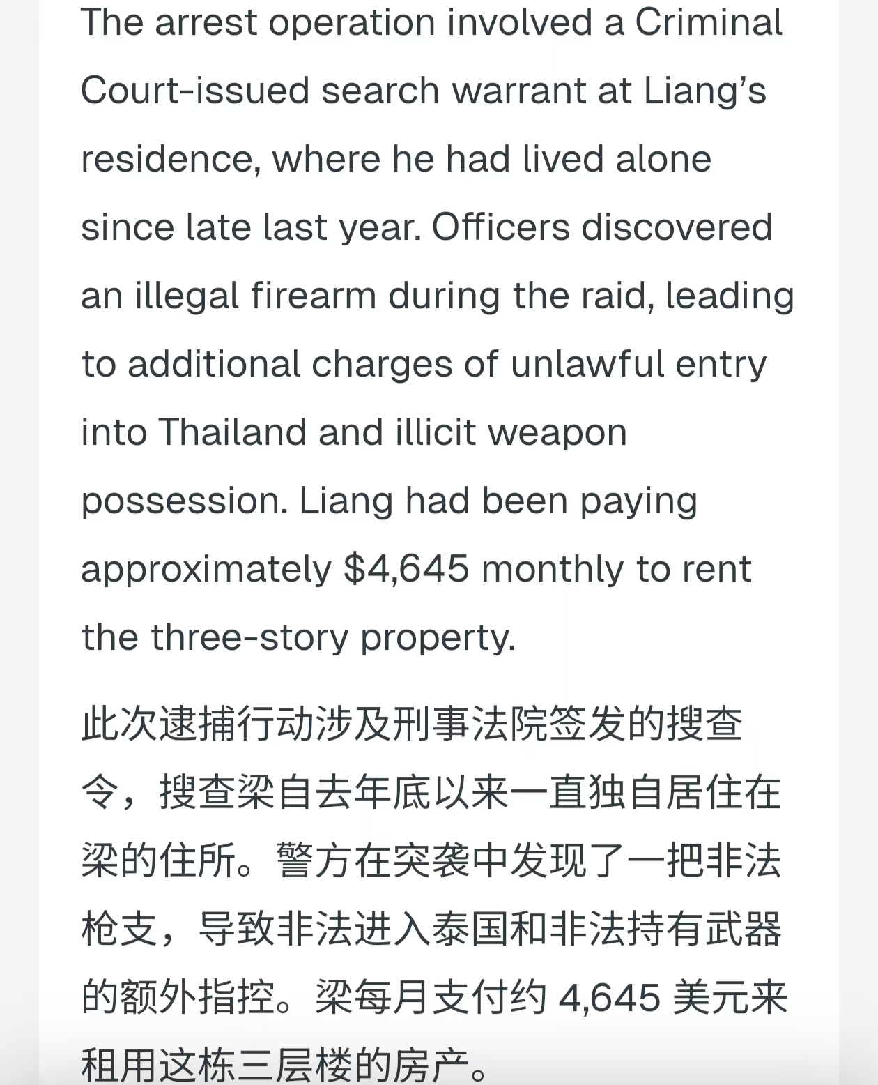 10月29日中午12时30分左右,泰国移民局警方持搜查令突击王通朗区的一栋三层联排别墅。梁爱兵当场被捕,警方在现场缴获非法枪支、电脑设备、文件和相关证据,这些物品显示他仍在遥控部分犯罪活动。泰国警方表示,此次行动结束了梁爱兵在泰国的“奢华逃亡生活”,并强调这是中泰两国执法合作的成果。