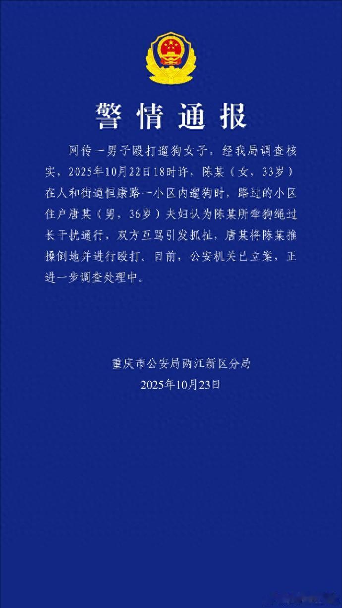 10月23日, 重庆警方发布情况通报,声明目前警方已经对陈某的事情进行立案,正在调查过程中。
