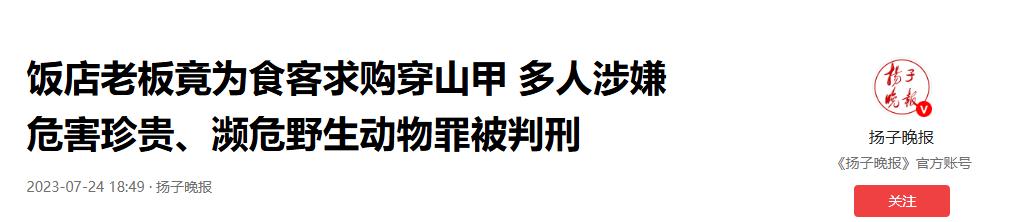 信息来源:扬子晚报 饭店老板竟为食客求购穿山甲 多人涉嫌危害珍贵、濒危野生动物罪被判刑 2023-07-24