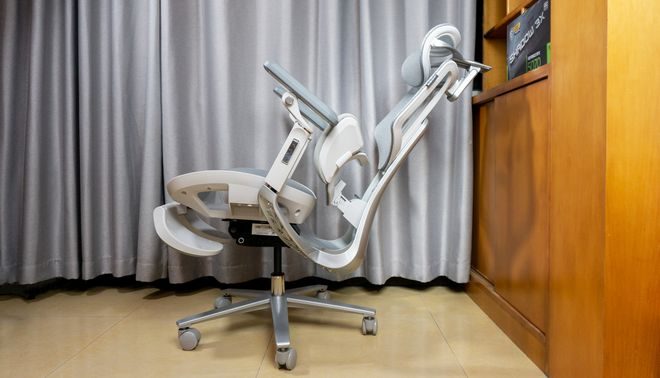 舒适度:除了护腰,夏草木Fit2在坐感上也下了功夫。六向回弹云感座垫支撑力比较均匀,不容易塌陷;NanoFlex4.0科技网布透气性好,夏天坐着不闷汗,久坐也不容易发热。靠背和座垫整体包裹感明显,但不会那种“死硬贴身”的感觉,更多是自然贴合。它支持145°无极后仰,办公时直坐稳当,想放松时也能顺滑后仰休息。整体坐感偏向“有支撑但不压迫”的类型,不是软塌塌那种舒适,而是比较健康取向的久坐舒适感。