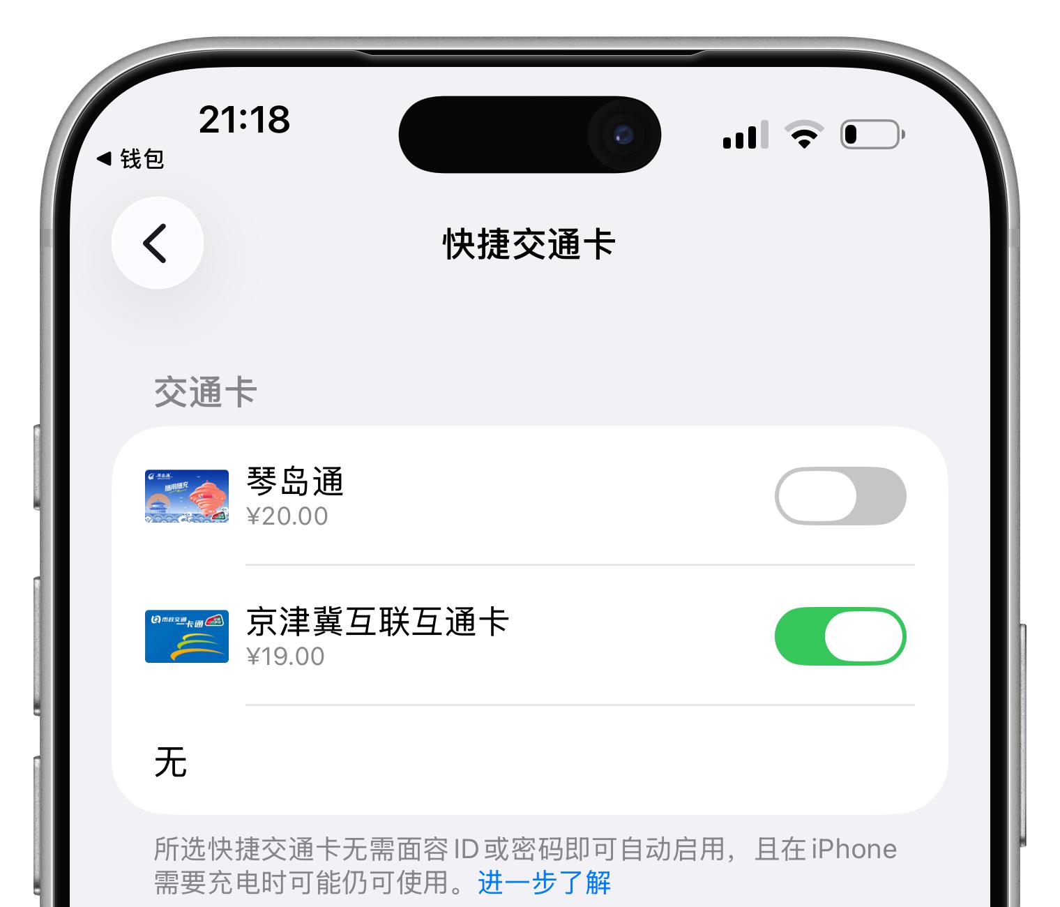 之后乘车直接刷手机即可。如果你有多张交通卡,可以把常用的设为「快捷交通卡」,不用唤醒、不用解锁,靠近闸机就能刷。iPhone 没电关机了也没关系,备用电量照样能刷卡。